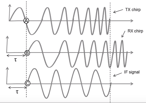 说明:发射信号(蓝色)和接收信号(红色)之间的频率差即为拍频,用于计算距离。